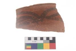 | Description / विवरण | Specimen of a potsherd with black decorative geometric painting on it.The potsherd is decorated with two horizontal bands, one on the rim and other on the body ,while between them are set of triple aches. |