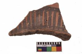 | Description / विवरण | Specimen of black on red ware with decorative geometric Vertical strokes set in two horizontal bands painting. |