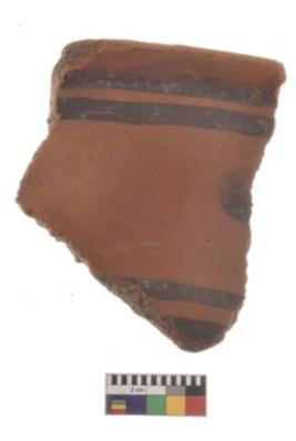 | Description / विवरण | Specimen of black on red ware with decorative geometric parallel lines painting. |