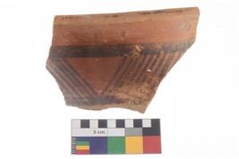 | Description / विवरण | Specimen of potsherd with black decorative geometric diamond set broad horizontal bands painting. |