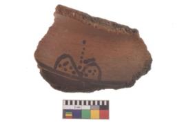 | Description / विवरण | Specimen of black on red ware with decorative geometric Pattern of linear pair if loop, dots and dotted line painting. |