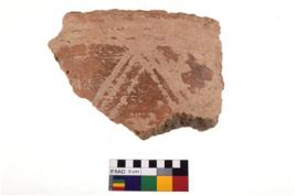 | Description / विवरण | A specimen of a potsherd. It is reddish in colour with black decorative geometric painting on it. |