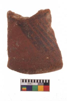 | Description / विवरण | Specimen of potsherd with decorative geometric Linear painting, Type Black on Red Ware . |