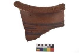 | Description / विवरण | Specimen of black on red ware with decorative geometric parallel lines painting. |