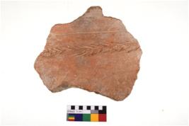 | Description / विवरण | A specimen of a potsherd. It is reddish in colour with decorative engraved painting on it. |