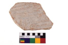 | Description / विवरण | A specimen of a potsherd. It is reddish in colour with decorative engraved painting on it. |