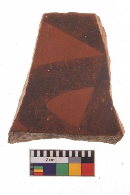 | Description / विवरण | Specimen of Potsherd black on red painted pottery. It is fine fabric in sharp contrast with painted design are executed in black pigment. |