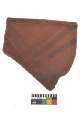 | Description / विवरण | Specimen of black on red ware with decorative geometric Groups of oblique strokes set in horizontal bands on the exterior painting. |