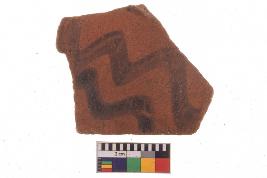 | Description / विवरण | Specimen of Potsherd black on red painted pottery. It is fine fabric in sharp contrast with painted design are executed in black pigment. |