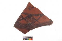 | Description / विवरण | Specimen of potsherd with decorative geometric Diamond set broad horizontal bands painting, Type Black on Red Ware . |