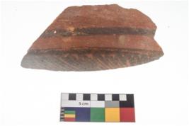 | Description / विवरण | Specimen of potsherd with black decorative linear painting . |