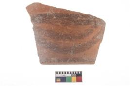| Description / विवरण | Specimen of potsherd black on red painted pottery. It is fine fabric in sharp contrast with painted design are executed in black pigment. |