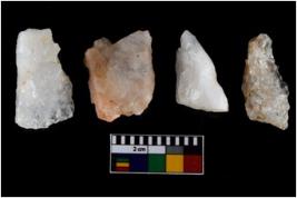 | Description / विवरण | There are n-4 of intact utilized flakes made up of Quartz. Some of them have bulge of percussion and some are flat flakes. |
