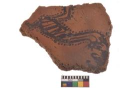 | Description / विवरण | Specimen of black on red ware with decorative geometric Pecock, stylised and decorated with doted outline painting. |