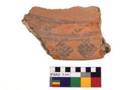 | Description / विवरण | A specimen of a potsherd. It is reddish in colour with black decorative geometric painting on it. |