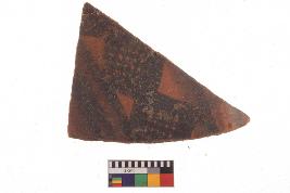| Description / विवरण | Specimen of potsherd with decorative geometric Diamond set broad horizontal bands painting, Type Black on Red Ware . |