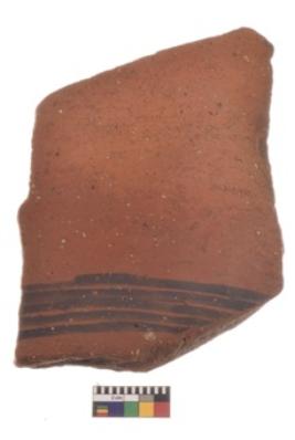 | Description / विवरण | Specimen of black on red ware with decorative geometric parallel lines painting. |