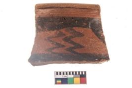 | Description / विवरण | Specimen of potsherd black on red painted pottery. It is fine fabric in sharp contrast with painted design are executed in black pigment. |