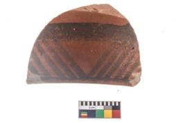 | Description / विवरण | Specimen of potsherd black on red painted pottery. It is fine fabric in sharp contrast with painted design are executed in black pigment. |