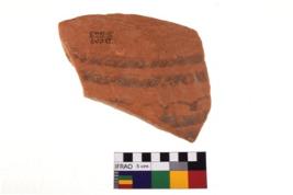 | Description / विवरण | A specimen of a potsherd. It is reddish in colour with black decorative geometric painting on it. |
