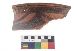 | Description / विवरण | Specimen of potsherd with black decorative geometric diamond set broad horizontal bands painting . |