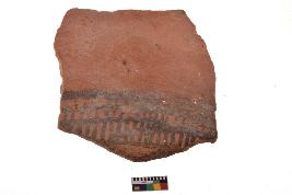 | Description / विवरण | Specimen of black on red ware with decorative geometric A triple row acrhes over a four horizontal band painting. |