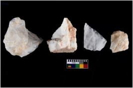 | Description / विवरण | There are n-4 of intact utilized flakes made up of Quartz. Some of them have bulge of percussion and some are flat flakes. |