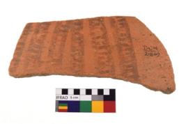 | Description / विवरण | A specimen of a potsherd. It is reddish in colour with black decorative animal painting on it. |
