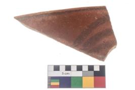 | Description / विवरण | A Specimen of a potsherd with black decorative geometric painting on it.The potsherd is decorated with two horizontal bands, one on the rim and other on the body ,while between them are set of triple aches. |