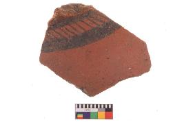 | Description / विवरण | Specimen of potsherd with black decorative geometric Linear painting, Type Black on Red Ware . |