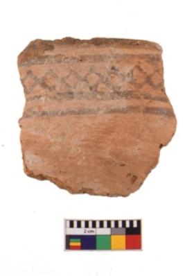 | Description / विवरण | A specimen of a potsherd. It is reddish in colour with black decorative geometric painting on it. |