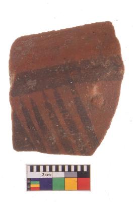 | Description / विवरण | Specimen of potsherd with black decorative geometric Linear painting, Type Black on Red Ware . |