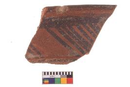 | Description / विवरण | Specimen of potsherd with black decorative geometric Linear painting, Type Black on Red Ware . |
