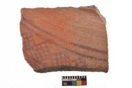 | Description / विवरण | Specimen of red on red ware with decorative geometric A row of latticed diamonds set in horizontal bands but having groups of oblique lines at intervals painting. |
