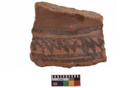 | Description / विवरण | Specimen of black on red ware with decorative geometric A row acrhes over a horizontal band painting. |