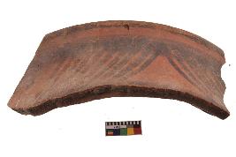 | Description / विवरण | Specimen of black on red ware with decorative geometric Groups of oblique strokes set in horizontal bands on the exterior painting. |