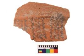 | Description / विवरण | A specimen of a potsherd. It is reddish in colour with black decorative geometric painting on it. |