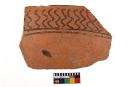 | Description / विवरण | A specimen of a potsherd. It is reddish in colour with black decorative geometric painting on it. |