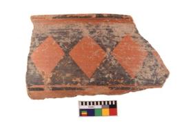| Description / विवरण | A specimen of a potsherd. It is reddish in colour with black decorative geometric painting on it. |