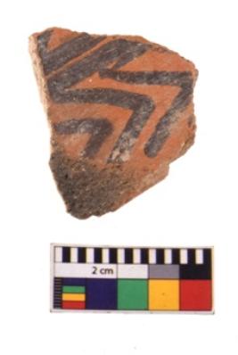 | Description / विवरण | A specimen of a potsherd. It is reddish in colour with black decorative geometric painting on it. |