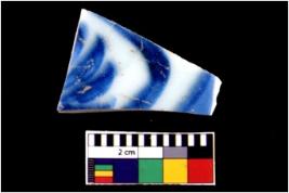 | Description / विवरण | Specimen has a glossy white surface with deep blue painting over it. |