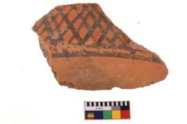 | Description / विवरण | A specimen of a potsherd. It is reddish in colour with black decorative geometric painting on it. |