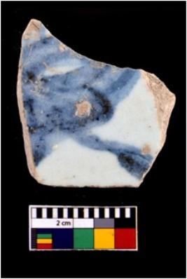 | Description / विवरण | Specimen has a glossy white surface with blue painting over it. |