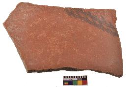 | Description / विवरण | Specimen of black on red ware with decorative geometric Two horizontal bands in oblique lines painting. |