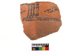 | Description / विवरण | A specimen of a potsherd. It is reddish in colour with black decorative geometric painting on it. |