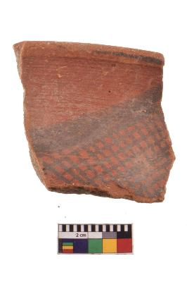 | Description / विवरण | Specimen of black on red ware with decorative geometric Two horizontal bands containing criss-cross pattern painting. |