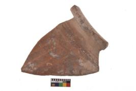 | Description / विवरण | Specimen of red ware with painting with faint blue geometric paintings over it. |