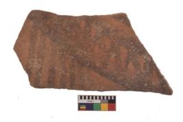 | Description / विवरण | Specimen of red ware with painting with faint blue geometric paintings over it. |