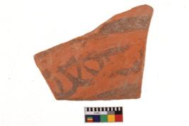 | Description / विवरण | A specimen of a potsherd. It is reddish in colour with black decorative geometric painting on it. |