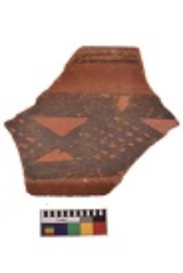 | Description / विवरण | Specimen of black on red ware with decorative geometric A row of latticed diamonds set in horizontal bands but having groups of oblique lines at intervals painting. |
